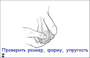 - Взять яичко так, чтобы большой палец был с одной стороны, а указательный и средний – с другой. Осторожно катать в пальцах яичко, прощупывая его, чтобы убедится в отсутствии любых твердых образований. Нормальные яичка у мужчин овальной формы, они должны быть упругими, но не твердыми, а также гладкими и без каких-либо комков.
